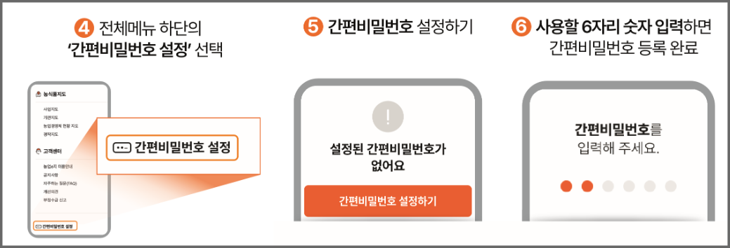 농업e지 앱을 설치하면 로그인 속도와 사용 편의성이 크게 올라갑니다. 특히 간편비밀번호(6자리)를 설정하면 다음 로그인부터 인증 과정이 더 빠르게 진행됩니다.